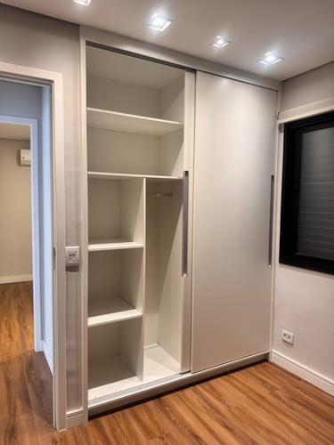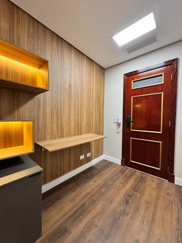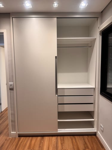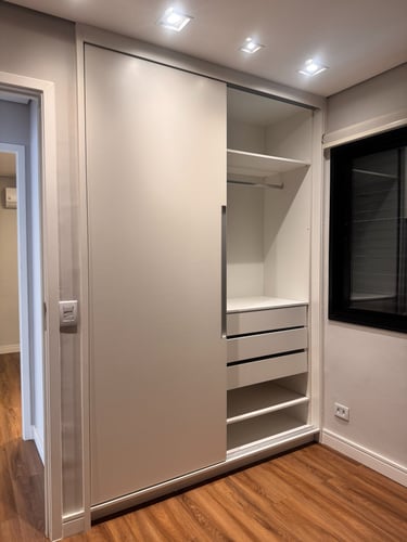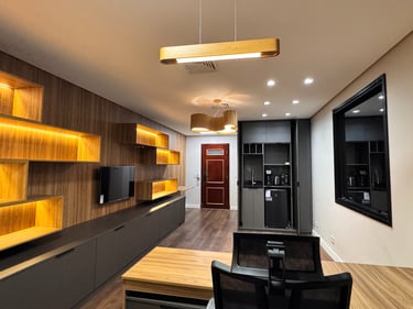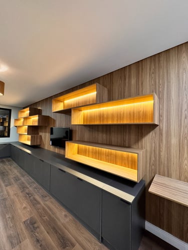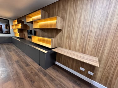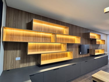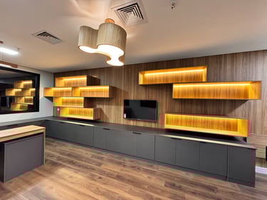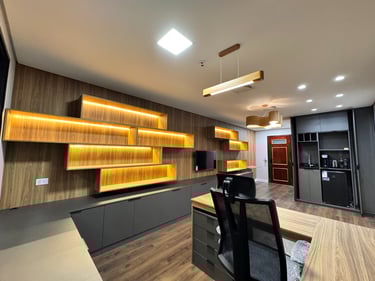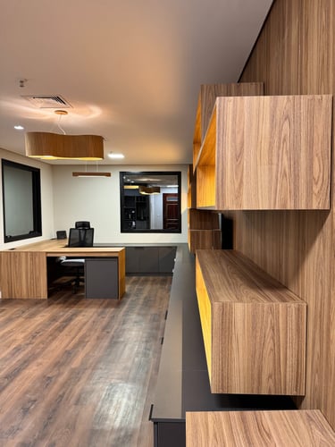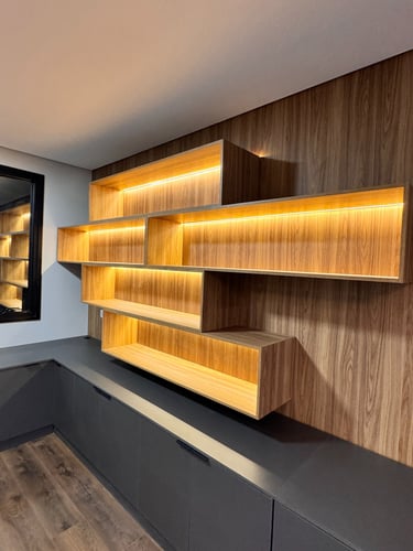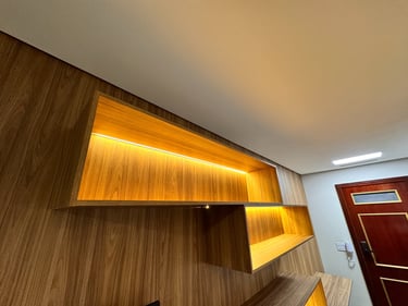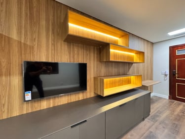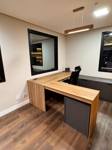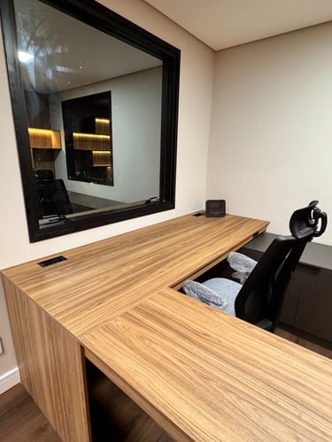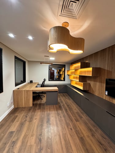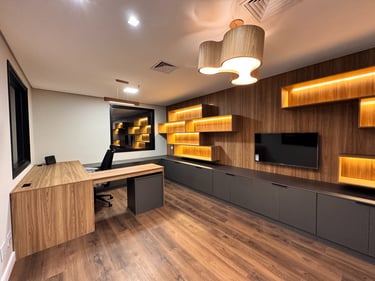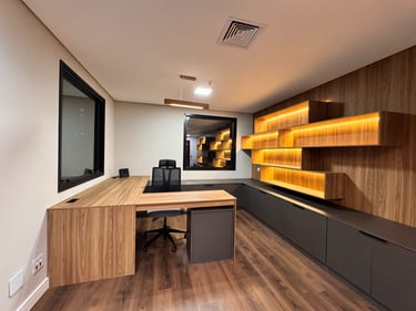 Home Office e Escritórios: Mesas de trabalho, prateleiras, armários e gaveteiros feitos sob medida para criar um espaço de estudo ou trabalho produtivo e confortável.