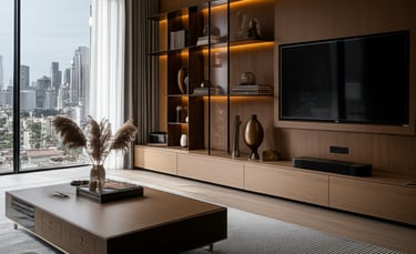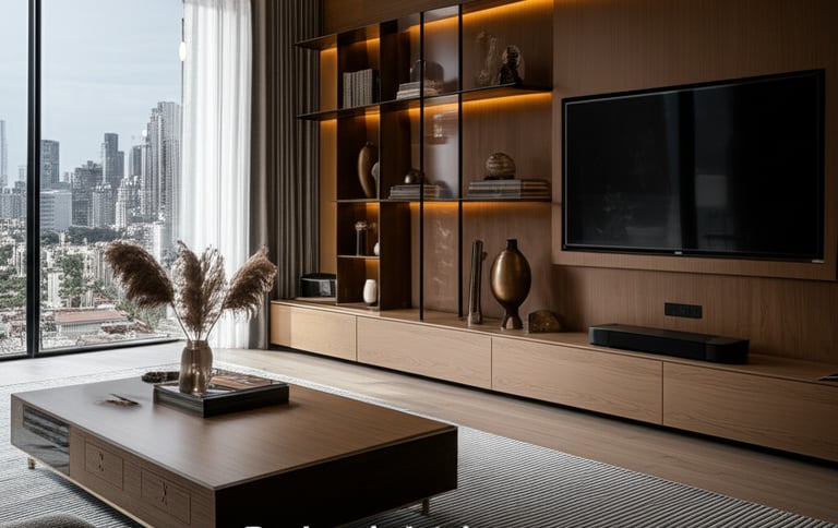 Salas e Áreas Sociais: Racks e painéis para TV, estantes, cristaleiras, adegas, mesas de centro, laterais e de jantar, além de móveis para bares e adegas.